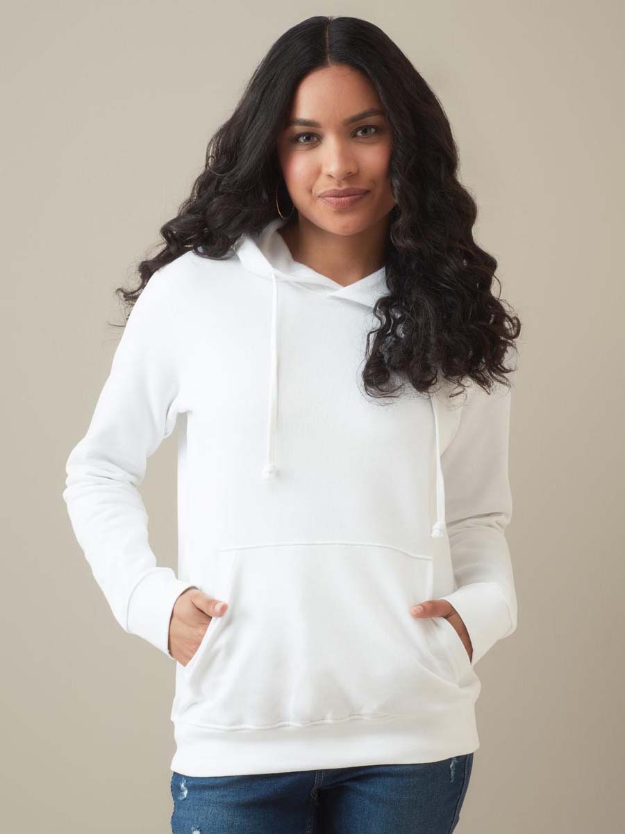 A durable ring-spun cotton-polyester-blend: midweight hooded sweatshirt for women, brushed inside with kangaroo pocket, elastic cuffs and waistband.