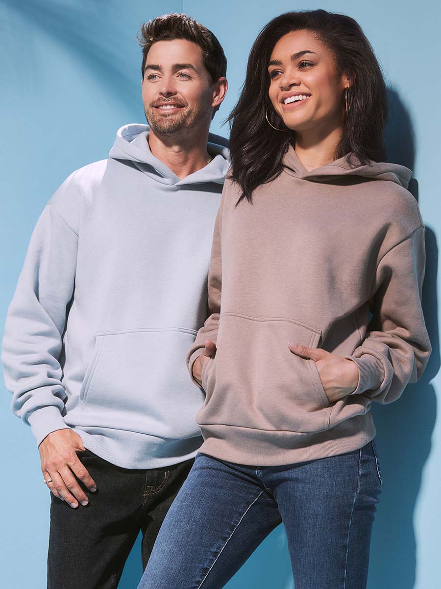 dropped shoulder, relaxed, modern shape, unisex style – great for both men and women, high-quality ring-spun combed cotton, double fabric hood without drawcord, kangaroo pocket, available in 10 colours, wide rib cuffs and waistband with elastane, tone-on-tone neck tape